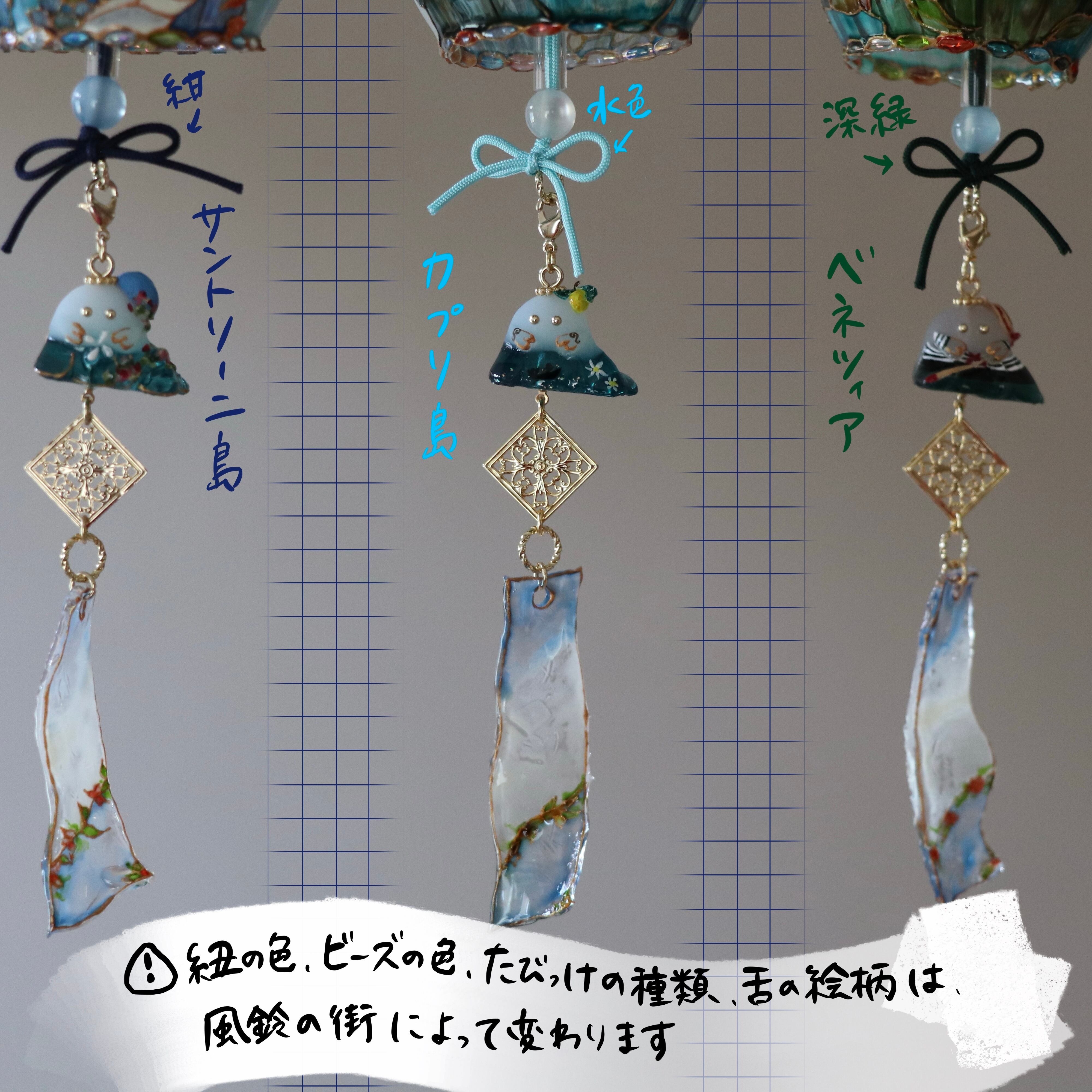 ▲風鈴の紐の色、ビーズの色、たびっけの種類、舌の絵柄は、風鈴の街並みによって変わります。サンプル写真でご確認をお願いいたします。